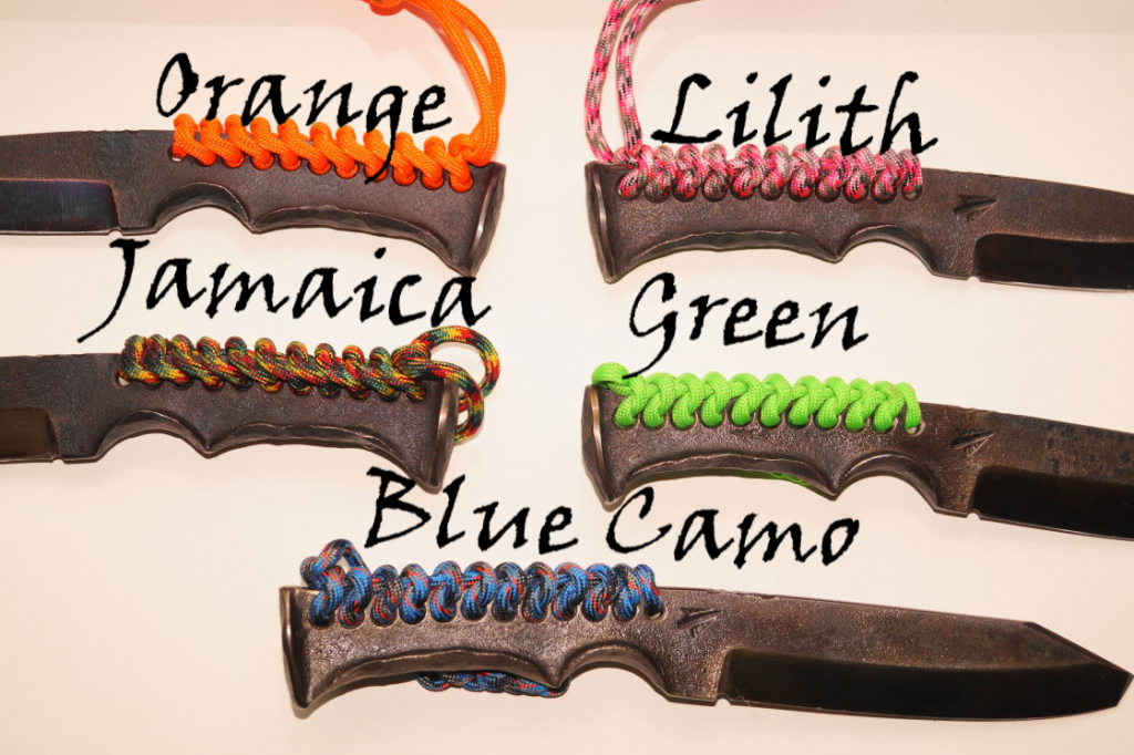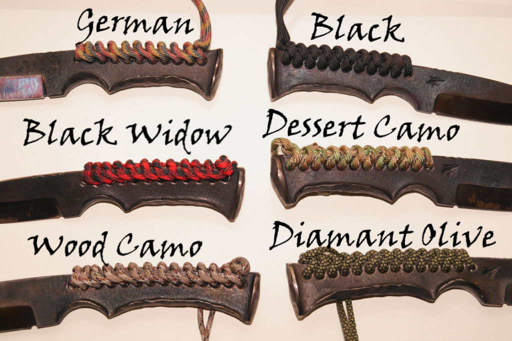 Die Griffwicklung ist ein Paracord = amerikanische Fallschirmleine. Wir haben viele verschiedene Farben auf Lager und können das Messer nach deinen Wünschen – z.B. an deine Bogenausrüstung – anpassen.