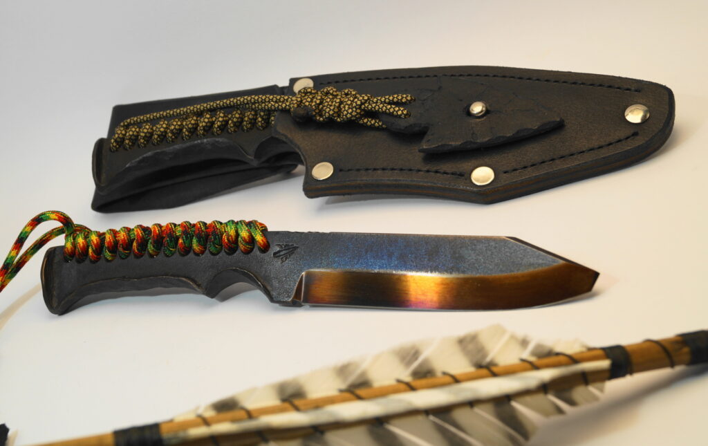 Die Lederscheide ist aus bestem Leder gearbeitet – Rahmengenäht – eine „Pfeilspitze“ aus Leder hält das Messer sicher fest. Die Gürtelschlaufe ist abnehmbar, so kannst du das Messer z.B. am Köcher befestigen.