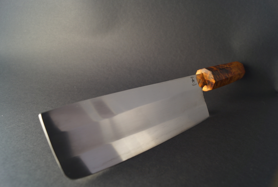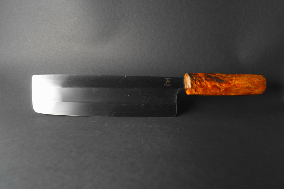 Kochmesser NAKIRI / Klingenlänge 20,5cm / Klingenhöhe 6,5cm / Gesamtlänge 35,5cm / Materialstärke 2,5mm / Stahl Böhler N690 / doppelseitiger S- Schliff / Griff karelische Maserbirke eingefärbt und stabilisiert € 395,- verkauft