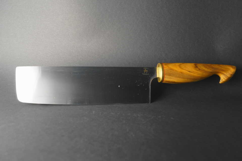 Kochmesser NAKIRI / Klingenlänge 20,5cm / Klingenhöhe 6,5cm / Gesamtlänge 35,5cm / Materialstärke 2,5mm / Stahl Böhler N690 / Griff Olive stabilisiert / Messing € 319,-
