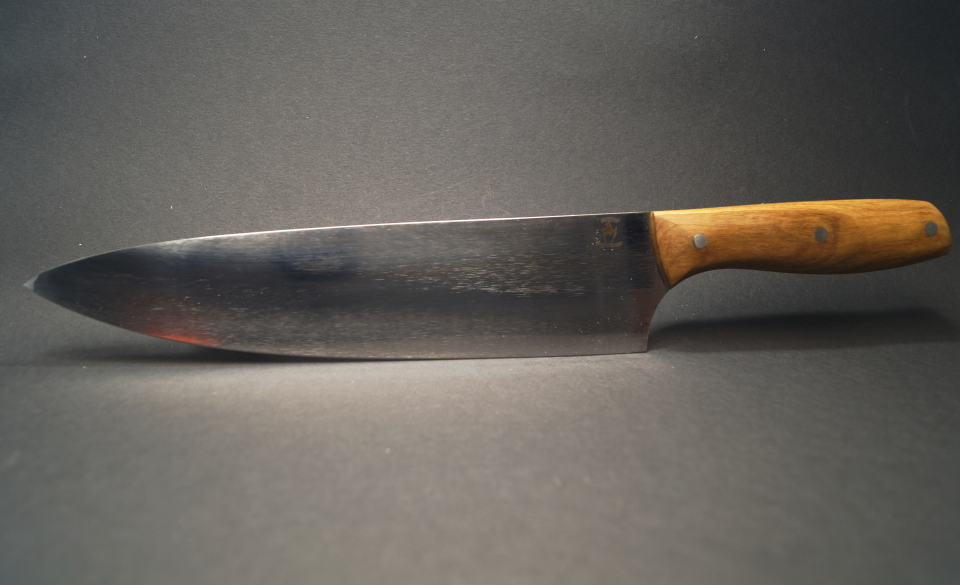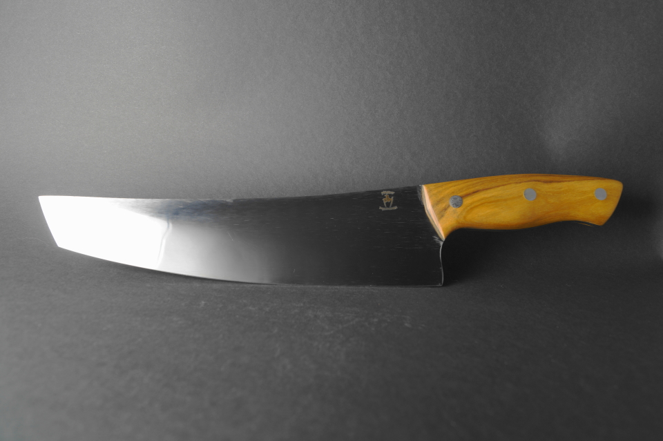 Kochmesser / Klingenlänge 24,5cm / Klingenhöhe 6cm / Gesamtlänge 38,5cm / Materialstärke 2,5mm / Stahl Böhler N690 / Griff Olivenholz stabilisiert / Corby Schraubnieten € 285,-
