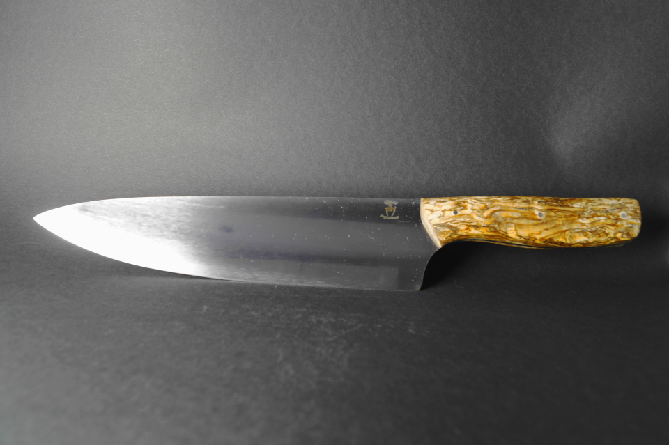 KOCHMESSER – Geometrie und Griff auf die Hand des Benutzers angepasst / ballig auf Null geschliffen / Klingenlänge 25cm / Gesamtlänge 38cm / Stahl Böhler N690 / Griff Micarta / Kundenauftrag – verkauft